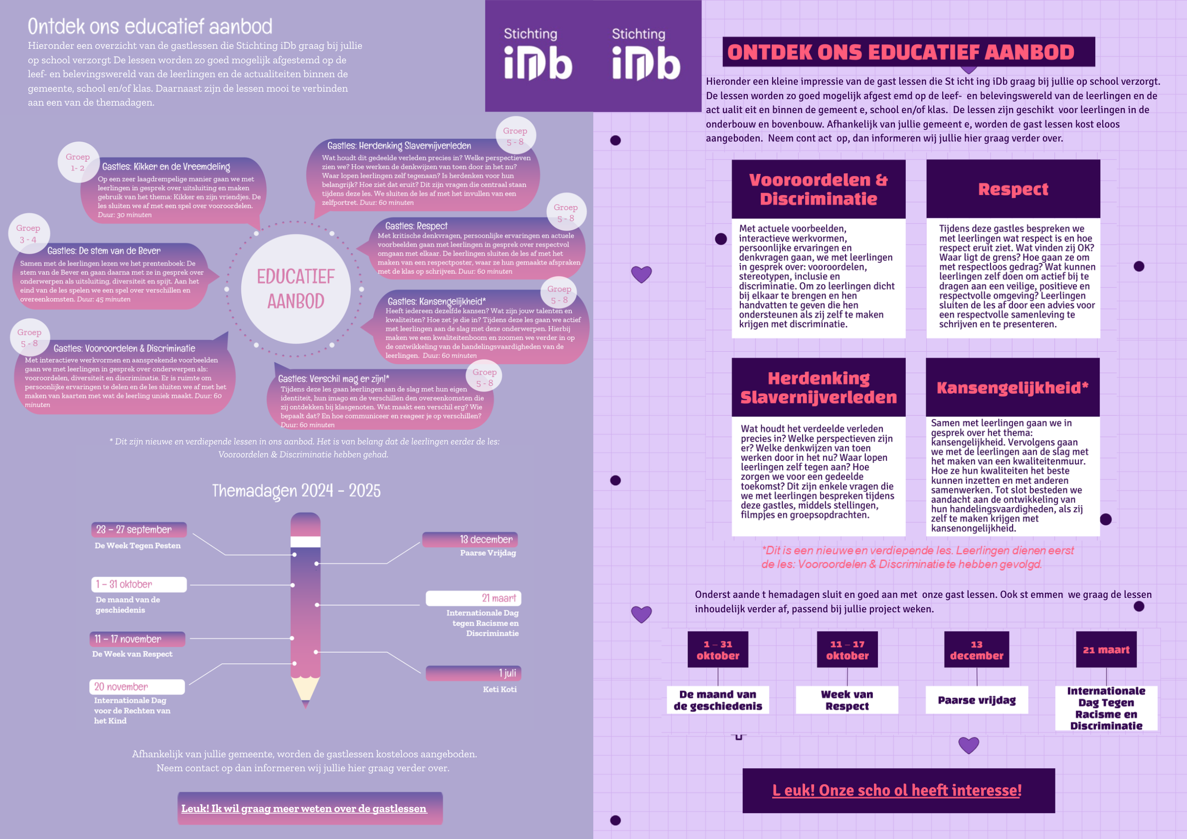 Wat is discriminatie precies? Waarom hebben mensen vooroordelen? Hoe kun je reageren op discriminatie? Hoe ga je om met pesterijen in de klas? Stichting iDb stemt haar voorlichtingen zo goed mogelijk af op de belevingswereld van de leerlingen, en actualiteiten binnen de regio / gemeente / wijk / school / klas. Zo kunnen we bijvoorbeeld meer aandacht geven aan een bepaalde discriminatiegrond, zoals seksuele gerichtheid, afkomst of lichamelijke beperking. In de lessen werken we veel met beeld en zijn er activerende werkvormen waarbij de leerlingen zelf aan de slag gaan.